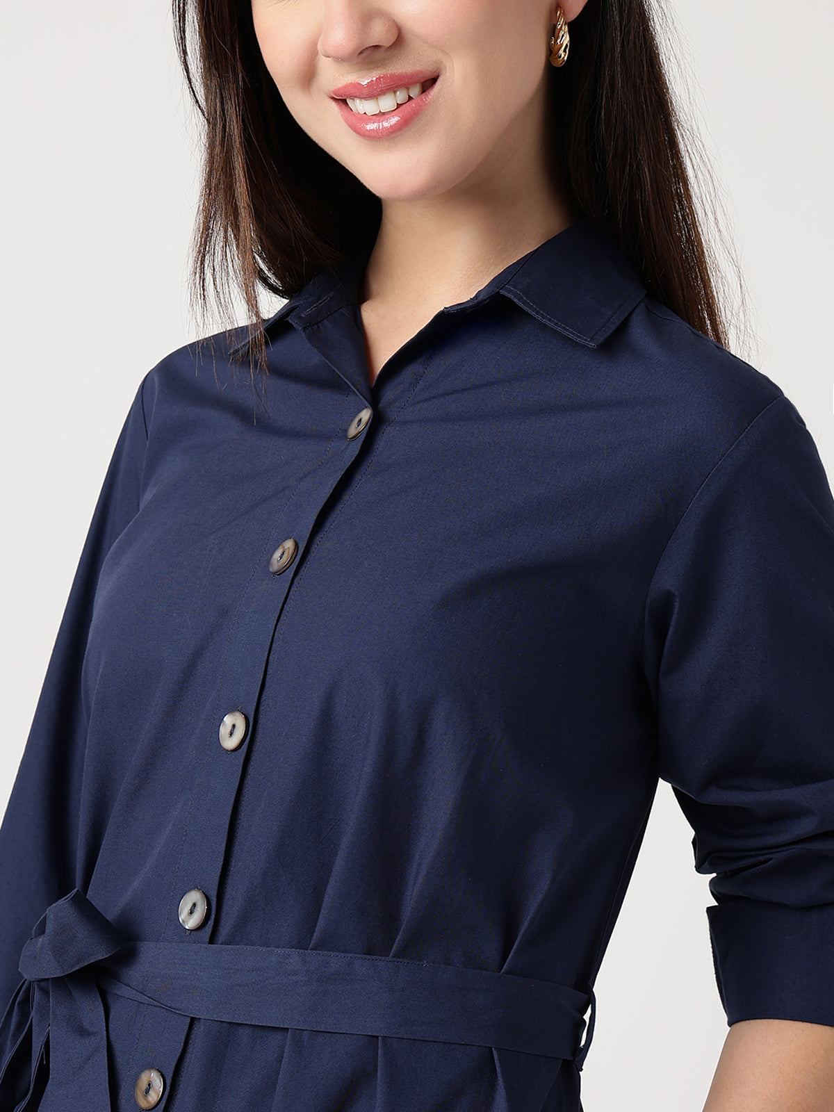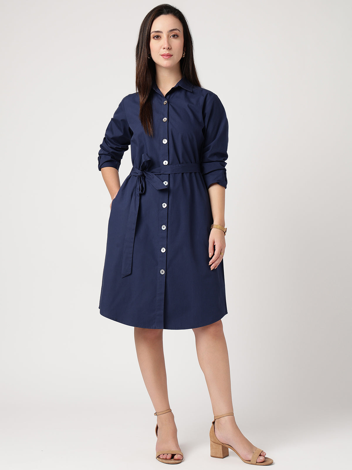 •Product Details: Navy cotton shirt dress featuring a classic collar, long sleeves, and button on the cuffs. Crafted from breathable cotton, it offers a crisp yet comfortable fit for everyday and office wear.