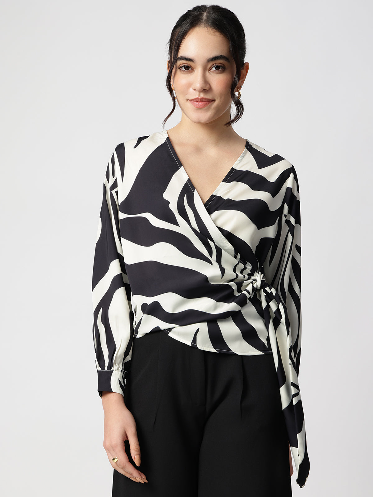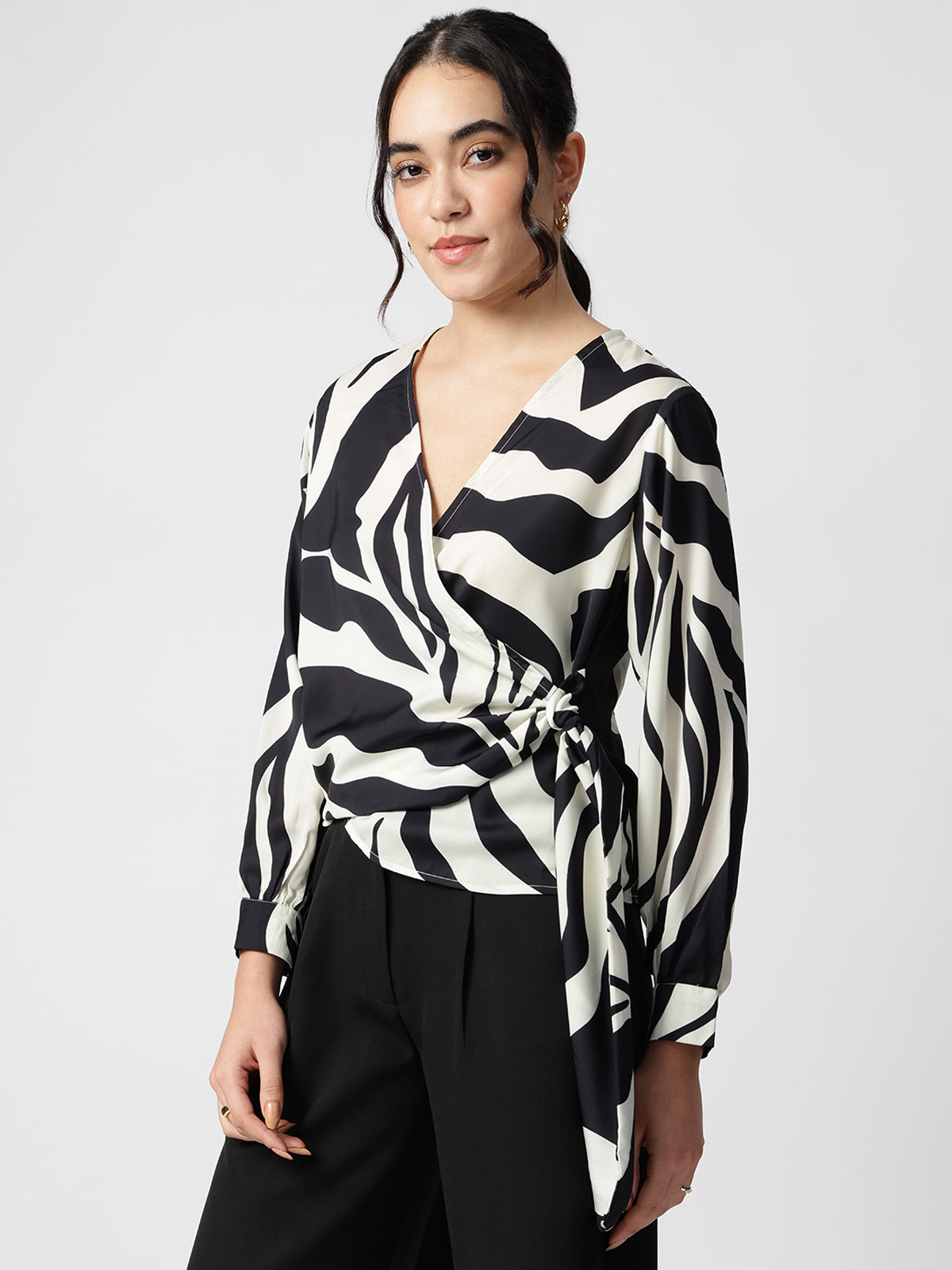 Elegant Black Satin top with V-neck and long sleeves, featuring a printed design. A sophisticated choice for evening wear or special occasions.