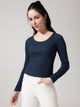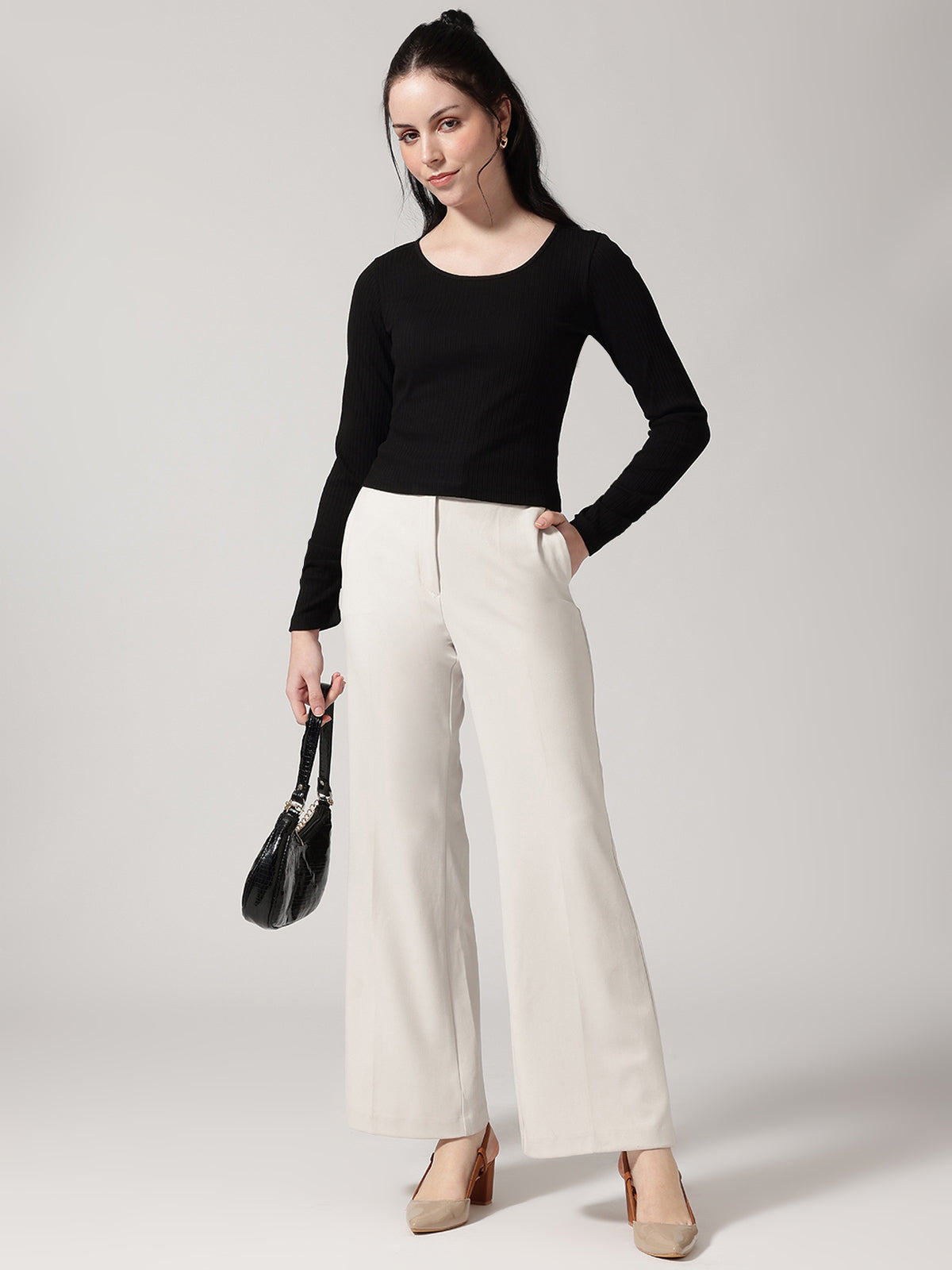Versatile and sleek, this black ribbed T-shirt is a wardrobe must-have. Its round neck and long sleeves make it ideal for day-to-night transitions and layering during cooler summer evenings.