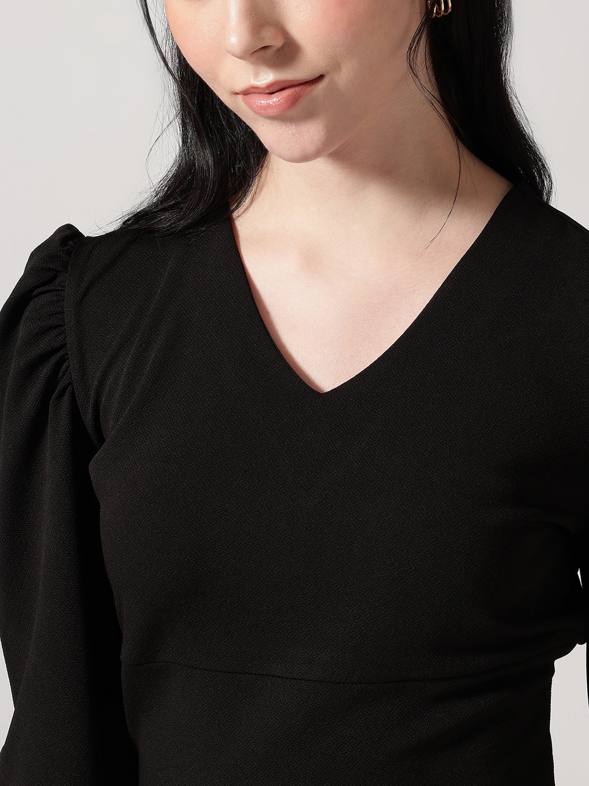 Dramatic yet sleek, this black V-neck crop top features voluminous puffed sleeves for a touch of flair. Made from smooth polyester, it's an ideal pick for both daytime dazzle and evening glam.