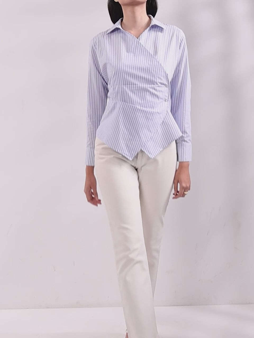 Stay sleek and confident in this blue striped wrap shirt. The slimming stripes and full sleeves create a flattering silhouette, ideal for work or a chic casual day.