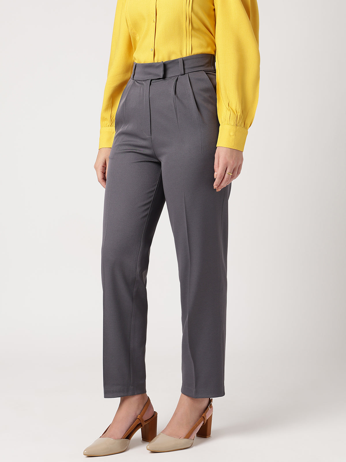•Product Details: Dark Grey trouser feature a flattering mid-waist design with front pleats and side pockets. Made from a soft, structured fabric