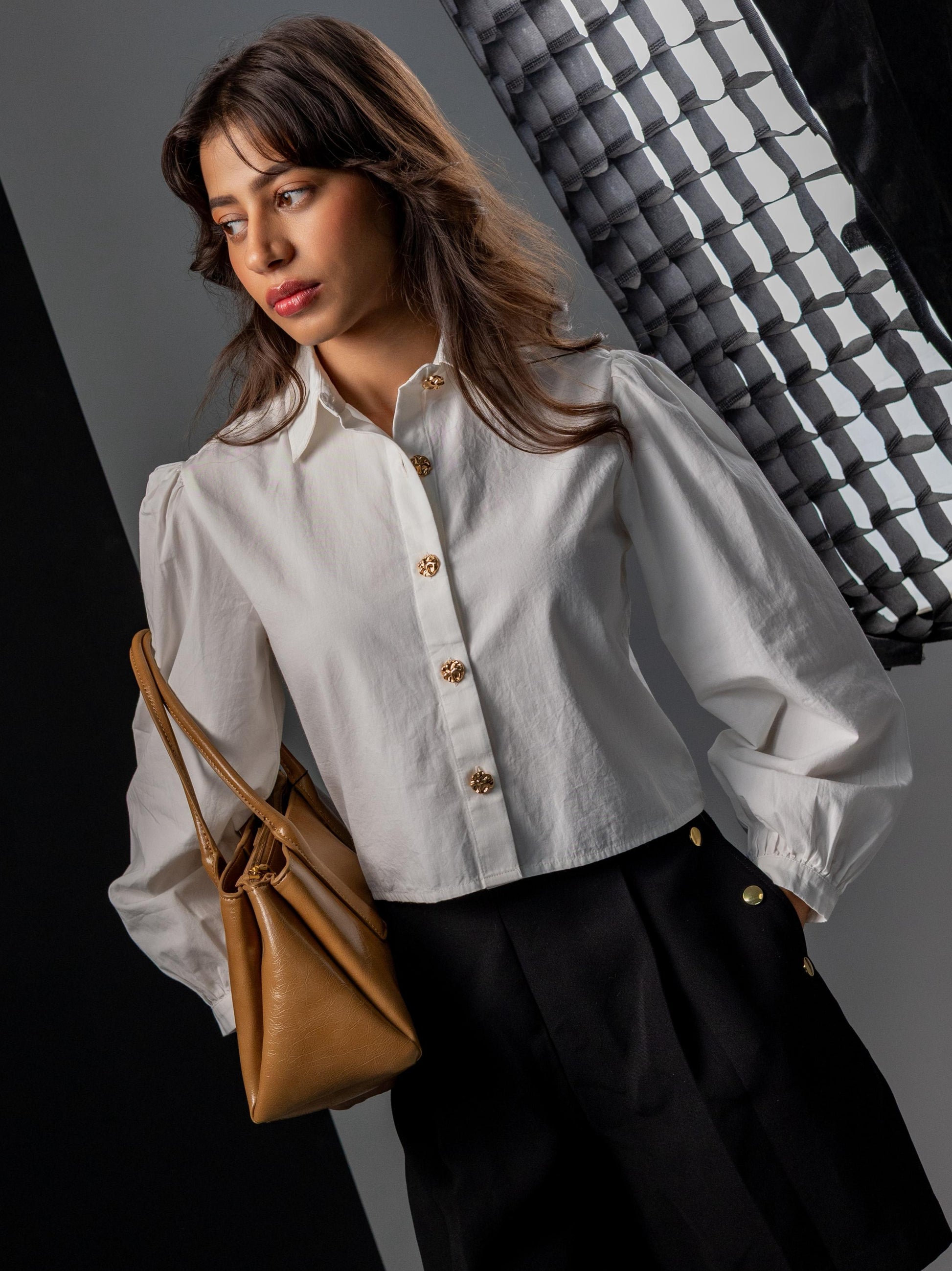 •Product Details: Solid white cropped shirt, featuring elegant golden buttons and a sharp collared neckline. Designed with full puff sleeves and a relaxed silhouette, this shirt adds a touch of sophistication