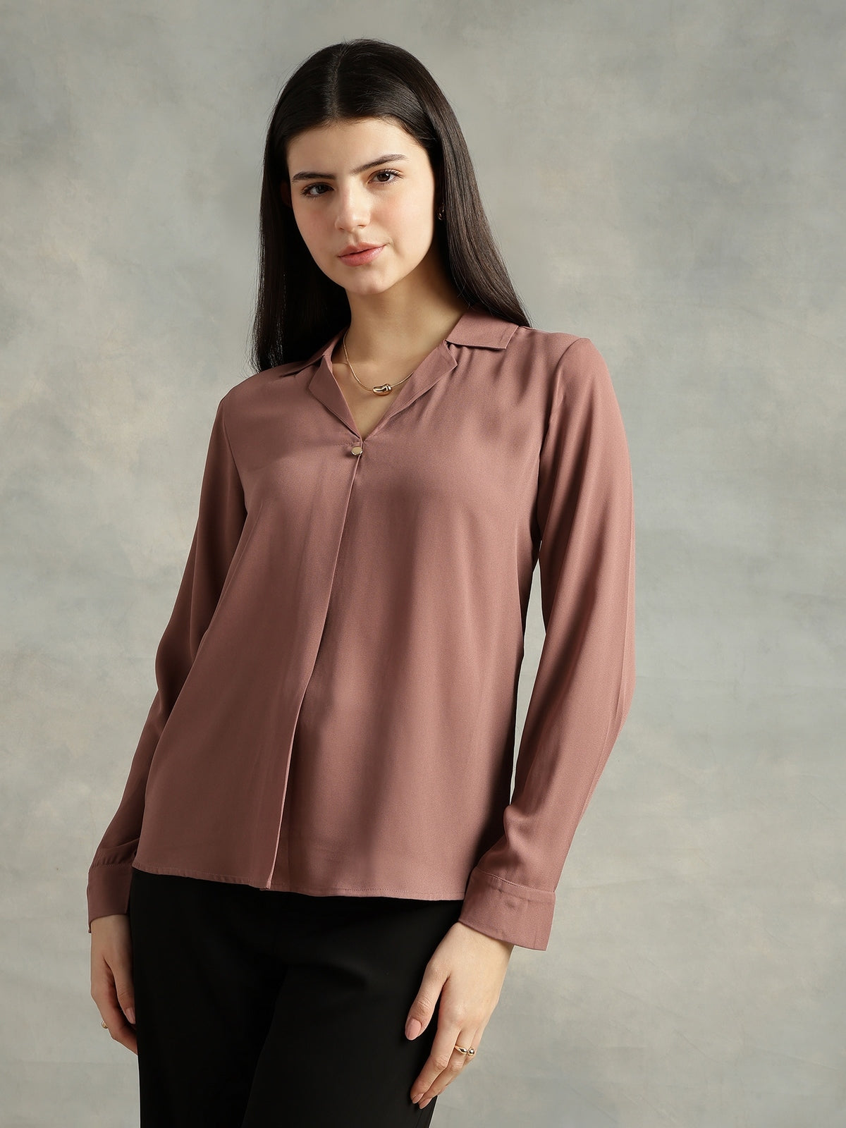 Refresh your wardrobe with this mauve Polyester top featuring a classic shirt collar and long sleeves, offering a timeless and polished look.