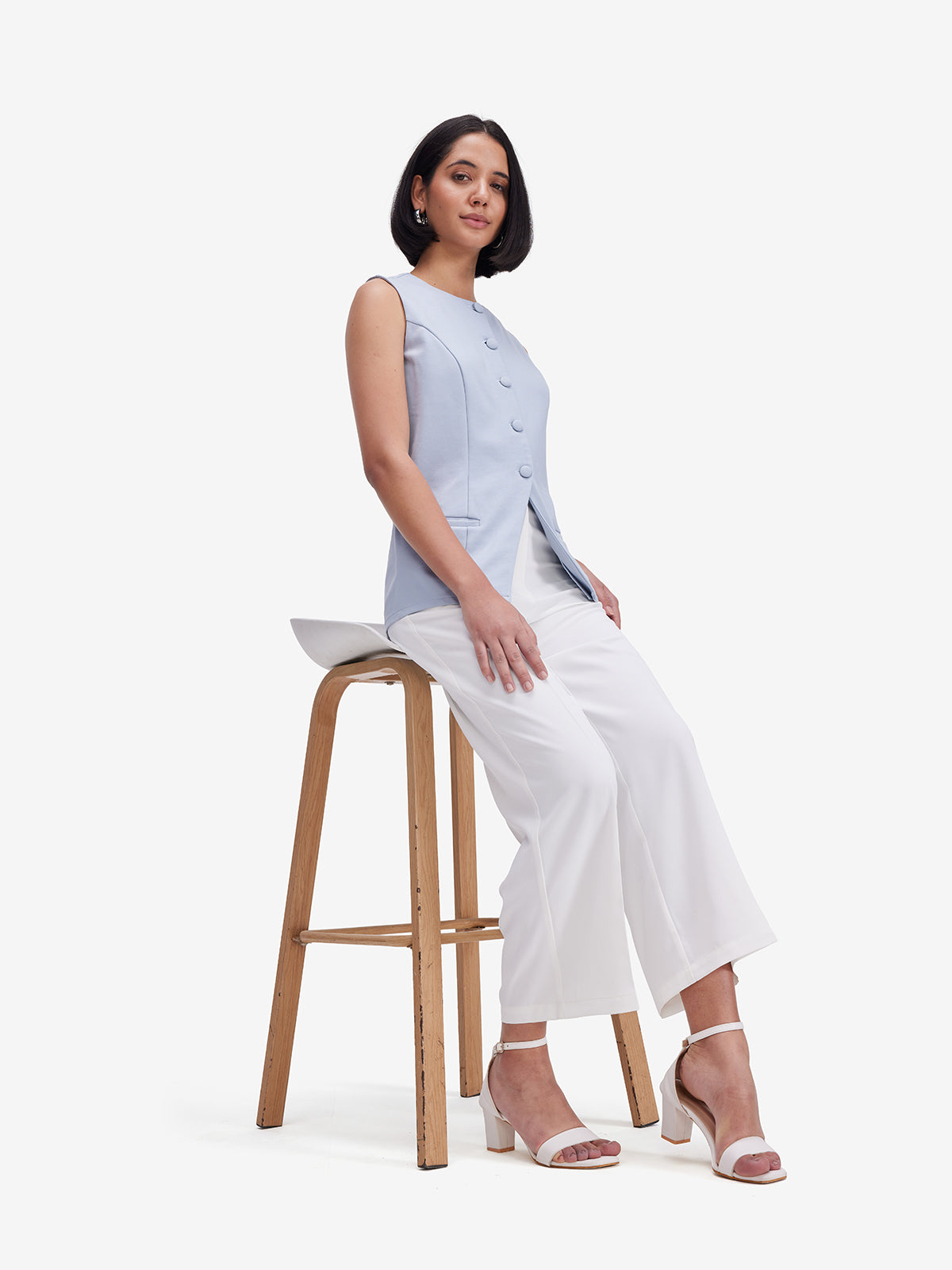 •Product Details : Sleeveless tailored waistcoat in powder blue with a round neckline, ornate Fabric buttons, and welt pockets. Designed with princess seams and a sharp front slit hem for a structured, elongating silhouette.