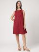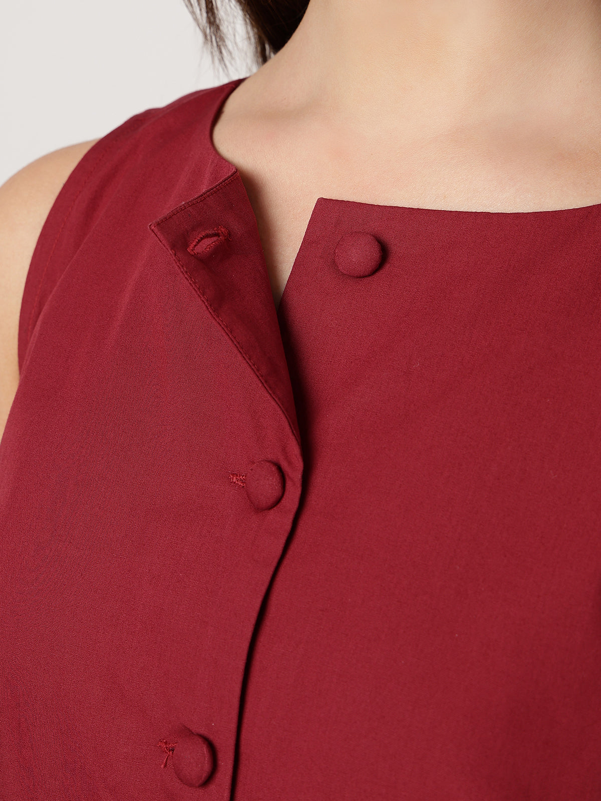 •Product Details: Sleeveless A-line dress in maroon with a clean round neckline and front fabric-covered button closure. Crafted for comfort and versatility, it offers a streamlined silhouette perfect for work or casual wear.